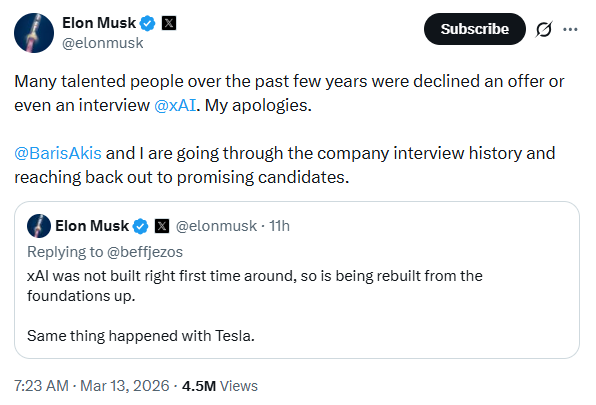 The timing is not incidental. In a post Musk wrote that xAI was not built right the first time and is being rebuilt from the foundations up. He is now bringing in the two people most responsible for the product that defined what good AI coding infrastructure looks like.
