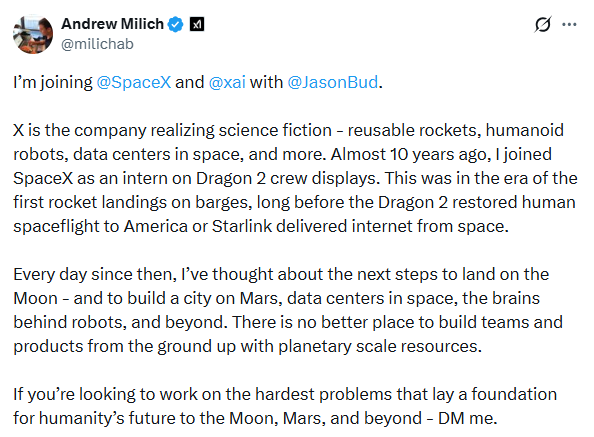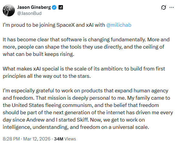 On March 12, Andrew Milich and Jason Ginsberg announced they are leaving Cursor to join xAI and SpaceX, where both will report directly to Elon Musk. The Information first reported the move, citing a person with direct knowledge. Musk reposted both announcements on X.